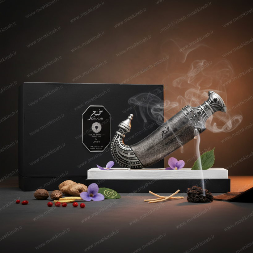 در نتهای پایانی، ترکیب بخور، چرم، خسخس و مشک رایحهای دودی، تاریک و بسیار ماندگار میسازد که امضای اصلی خنجر محسوب میشود؛ پایهای که حس وقار و اقتدار را تا ساعتها حفظ میکند.